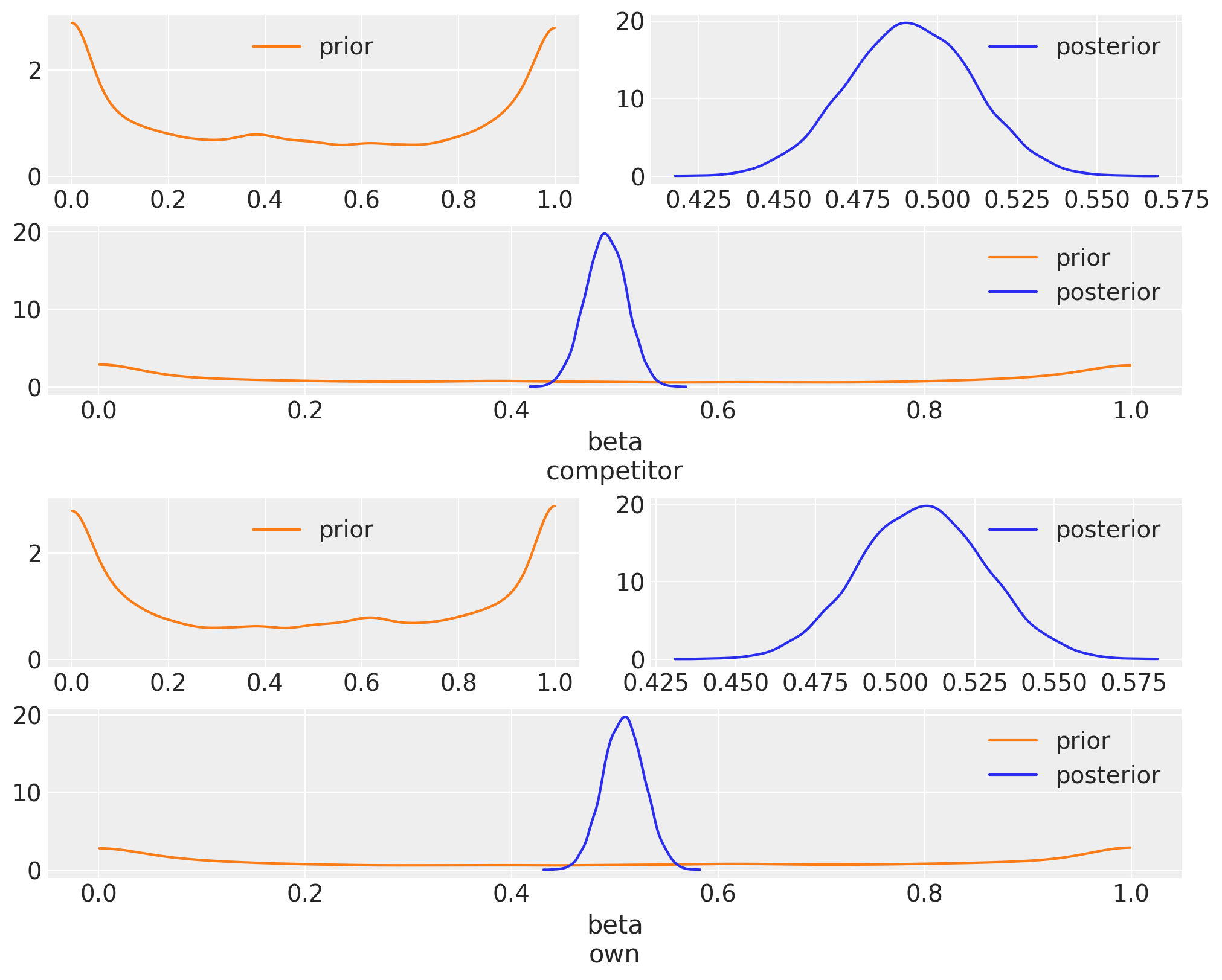 This can be seen quantitatively by examining the \(\beta\) weights. The 94% credible intervals of the relative contribition of new product sales to the competitor and own sales are much broader, at roughly \(\pm 10\%\).