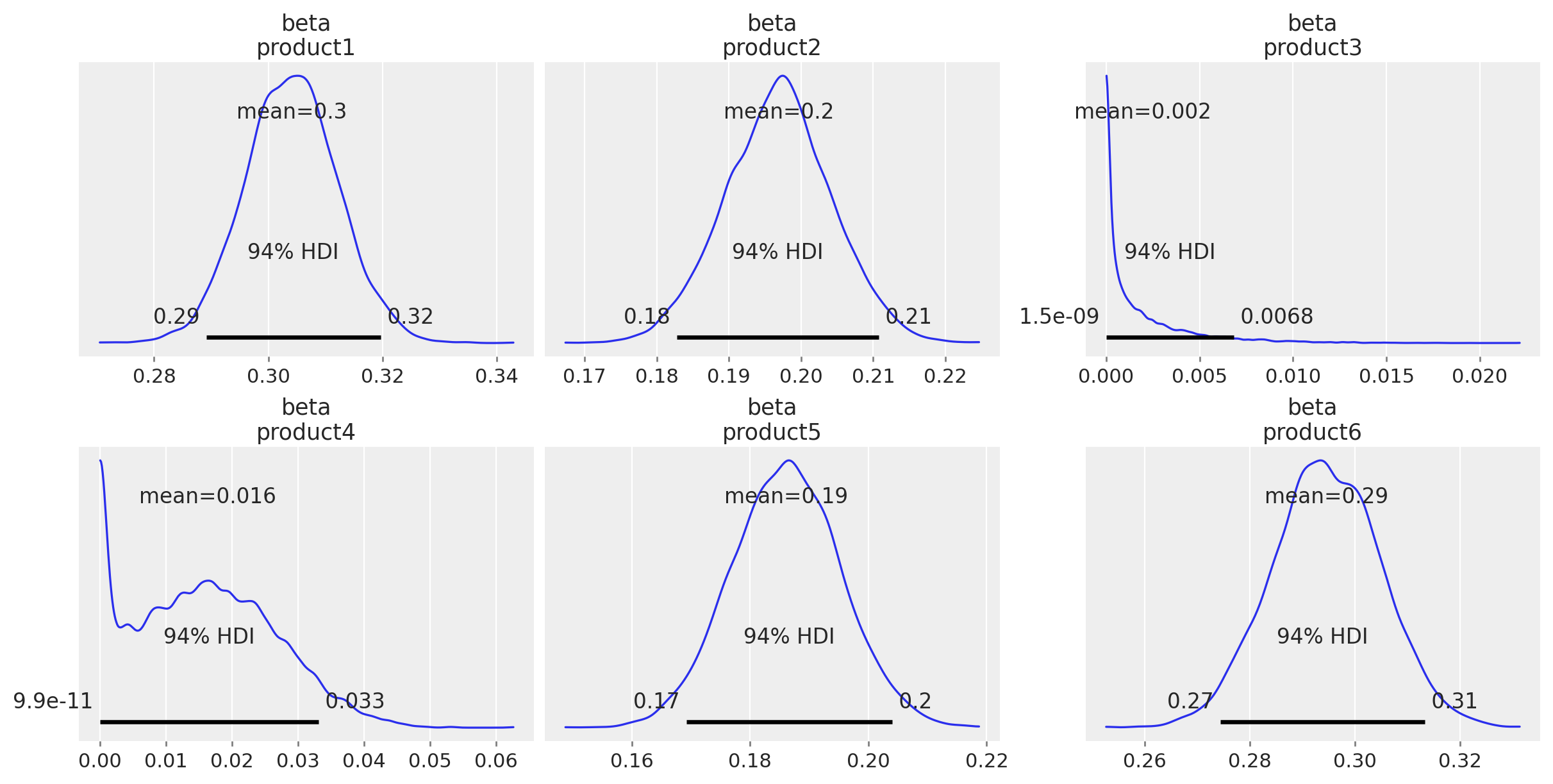 Finally, we can inspect the \(\beta\) coefficients which tells us what proportion of the new sales come from any given existing product.