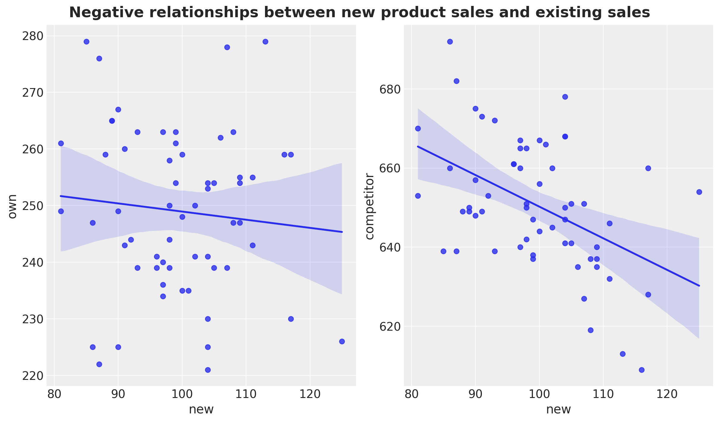 Let’s take a look at the relationship between the new product sales and both the own and competitor sales. We can see negative correlations, and this makes sense from the MVITS modeling perspective. This is because it models sales of existing products as being decreased by some fraction of the new product sales. So the model assumes that (in the post product launch period) that as the new product sales increase, the sales of the own or competitor will either decrease or remain unchanged.