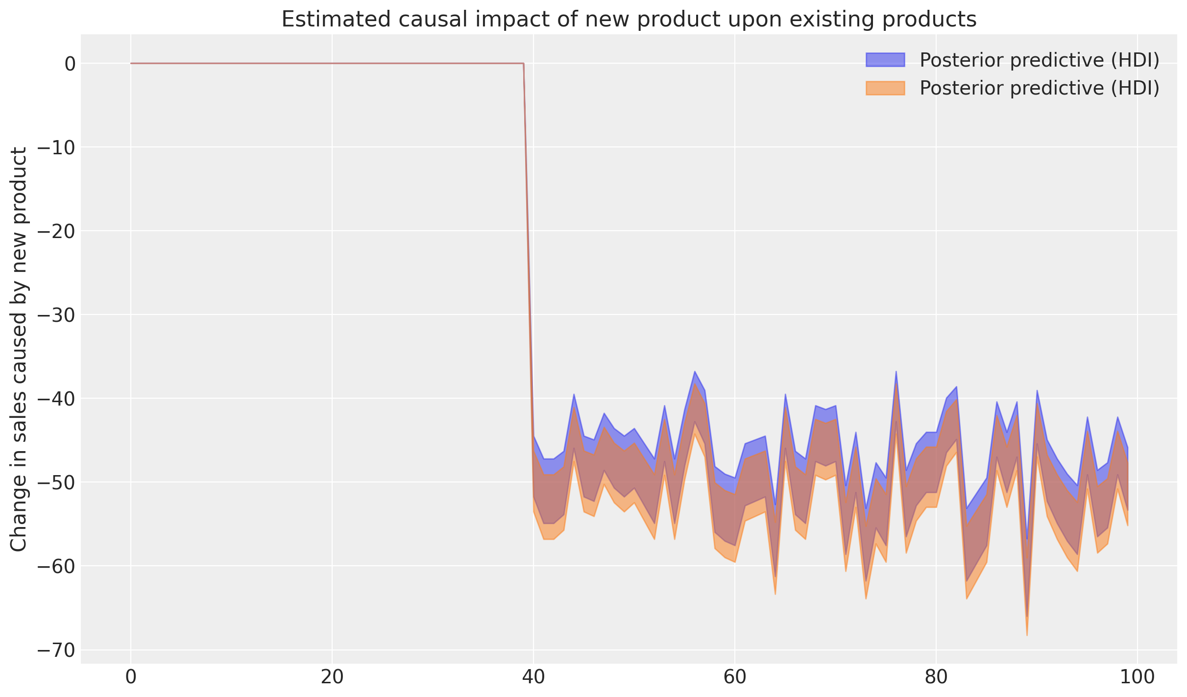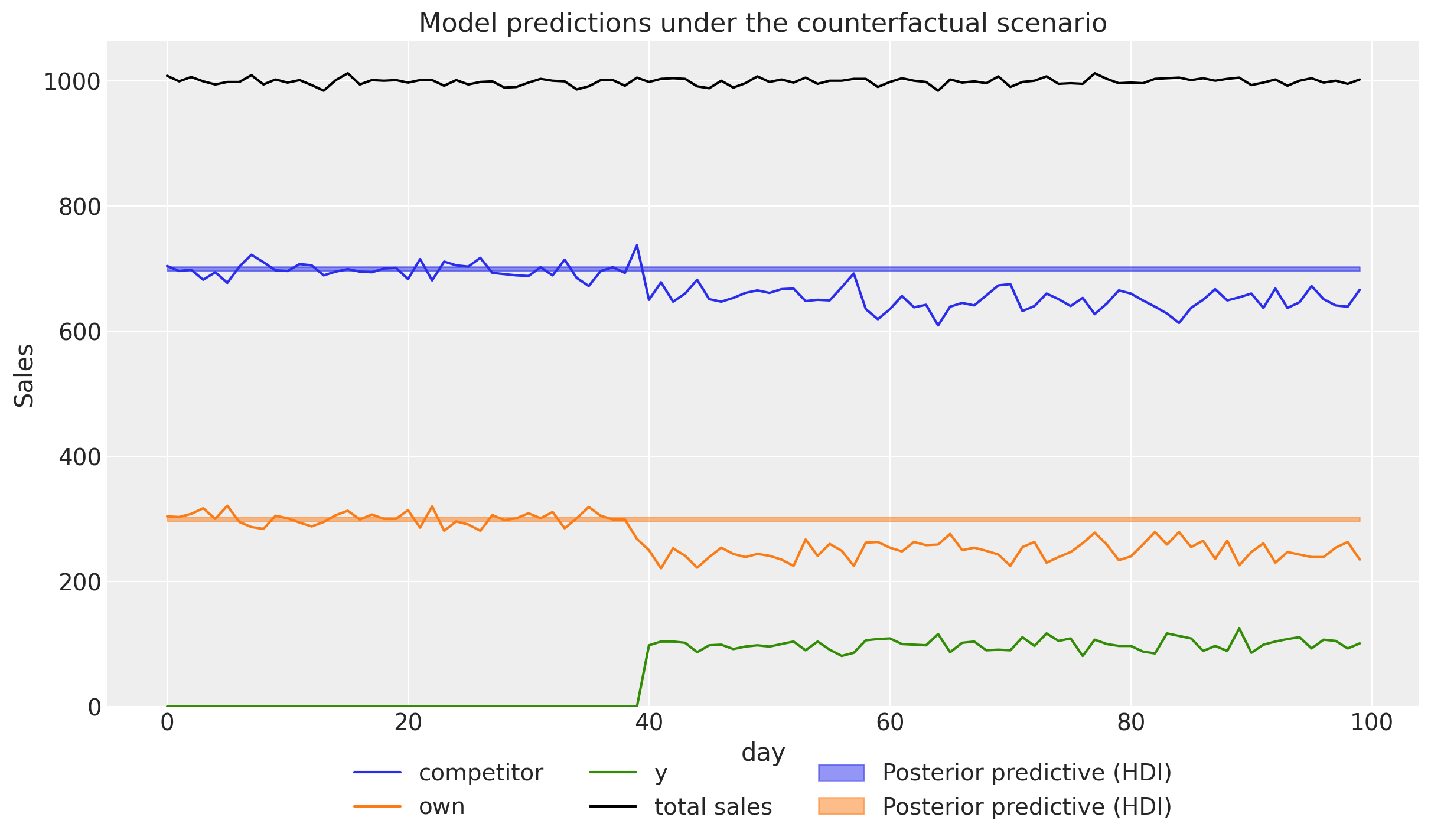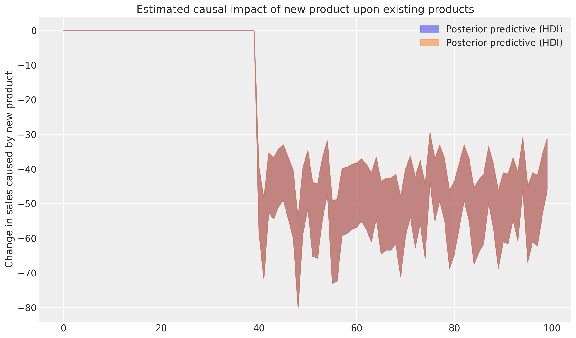 The counterfactual scenario is evaluated by setting the sales of the new product (using PyMC’s do