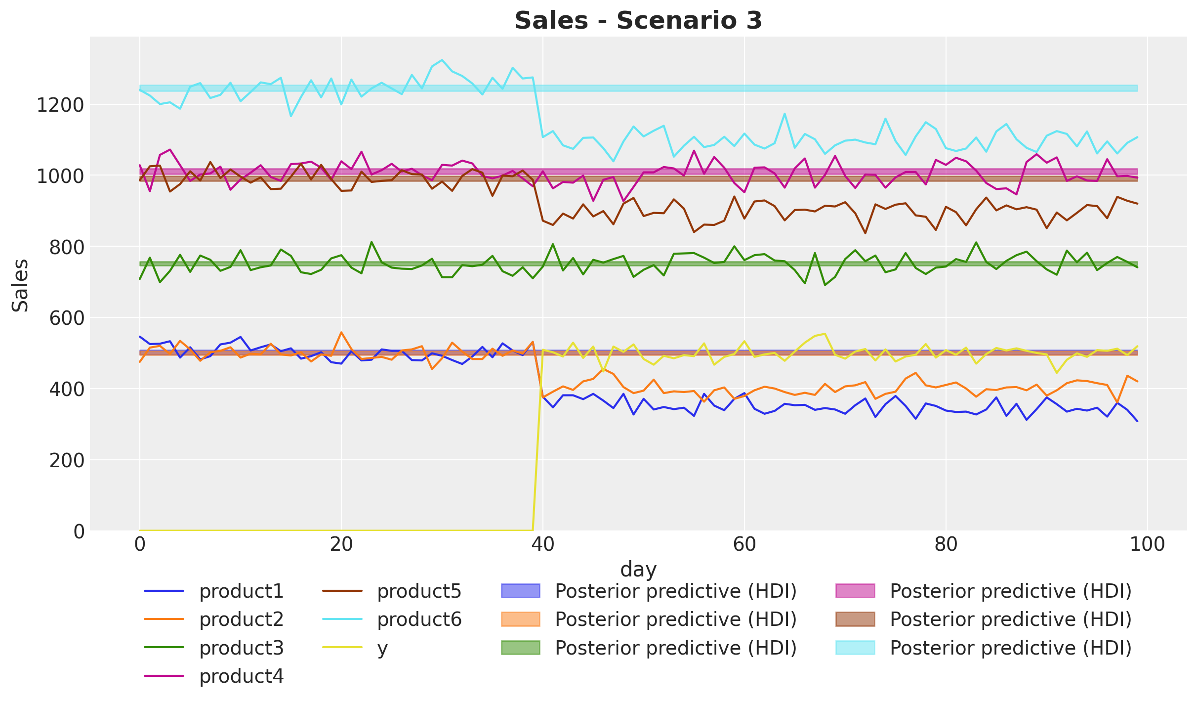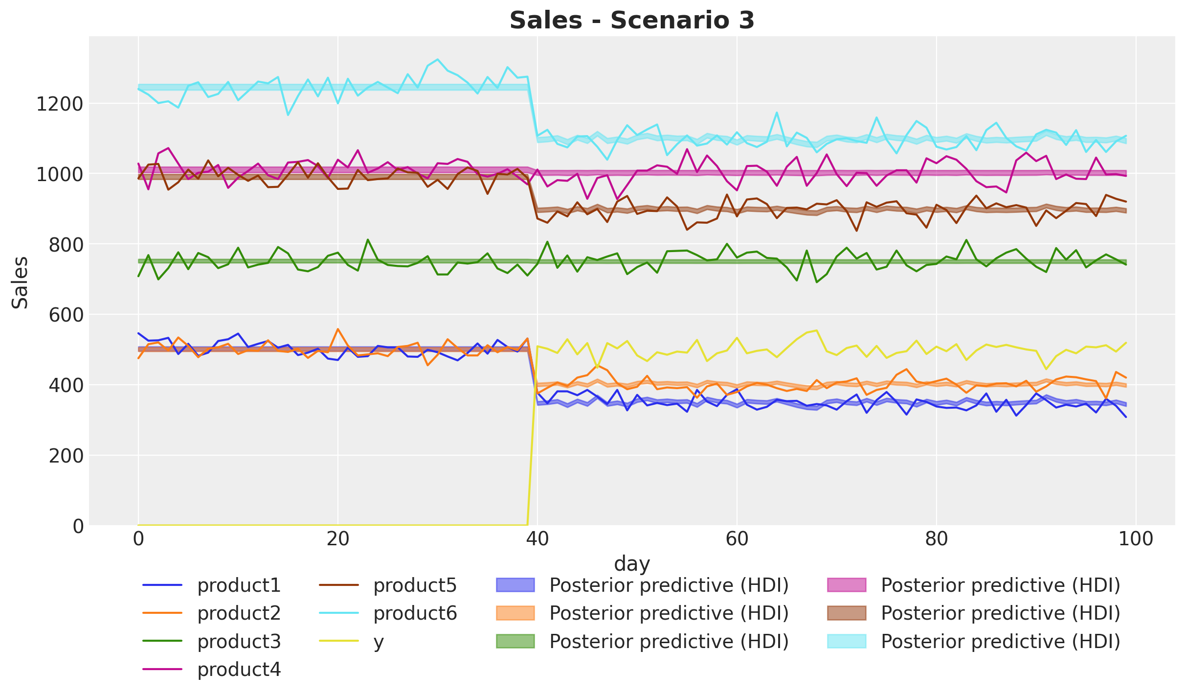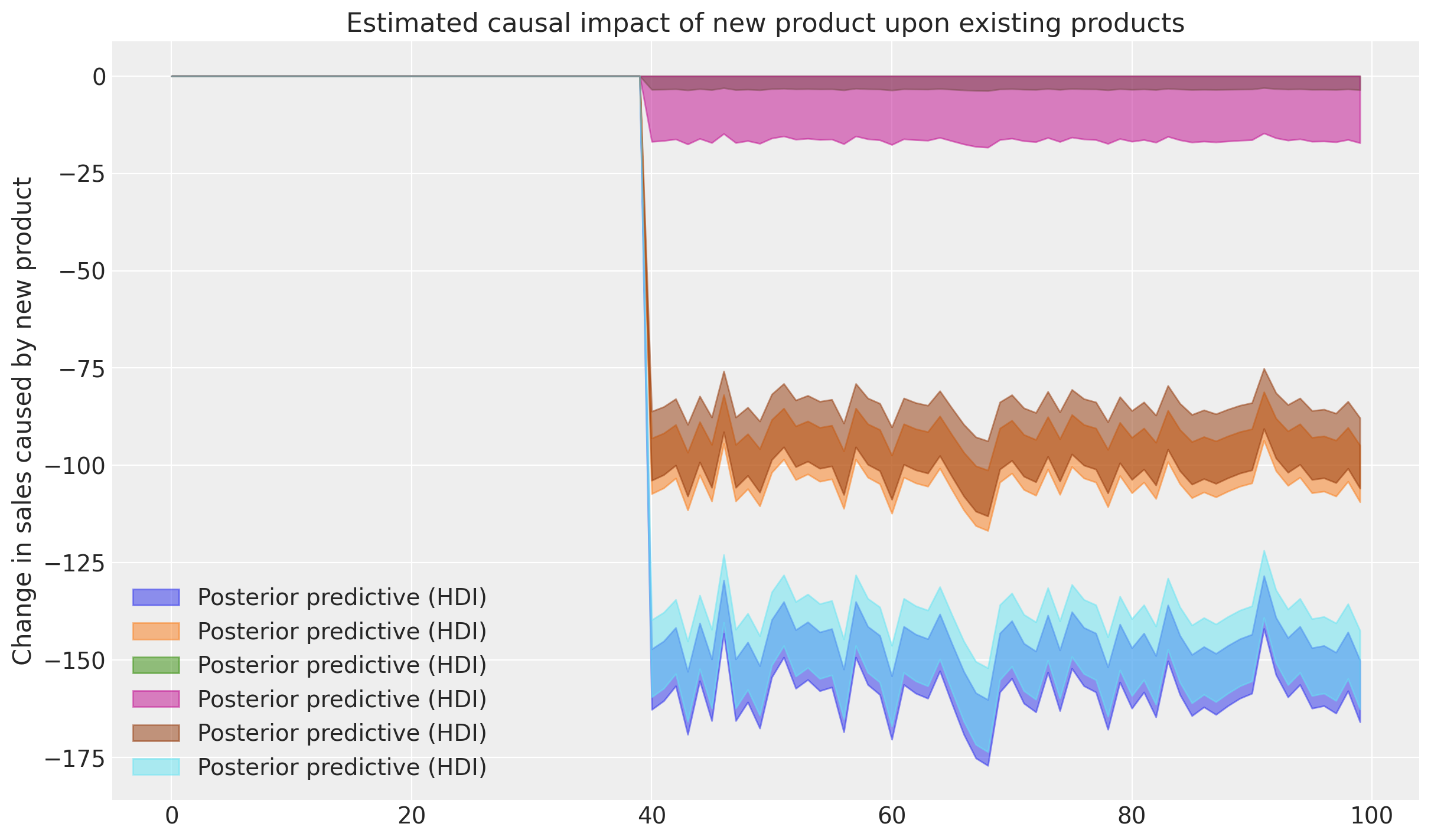 The counterfactual scenario is evaluated by setting the sales of the new product (using PyMC’s do