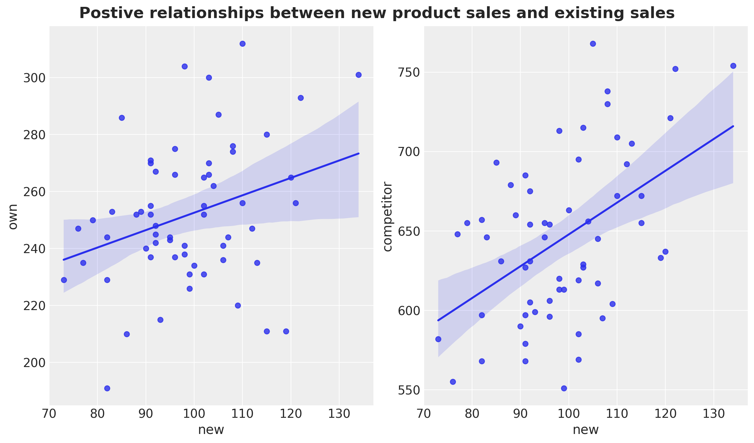 Why is this happening? For any given point in time, because own and competitor sales are drawn from a multinomial distribution, we would expect the empirical sales counts to reflect the (unchanging in this example) latent market shares. However, the high variability in total sales induces a positive correlation in sales counts. On days where there are more total sales, there tends to be more new product sales and more own and competitor sales.