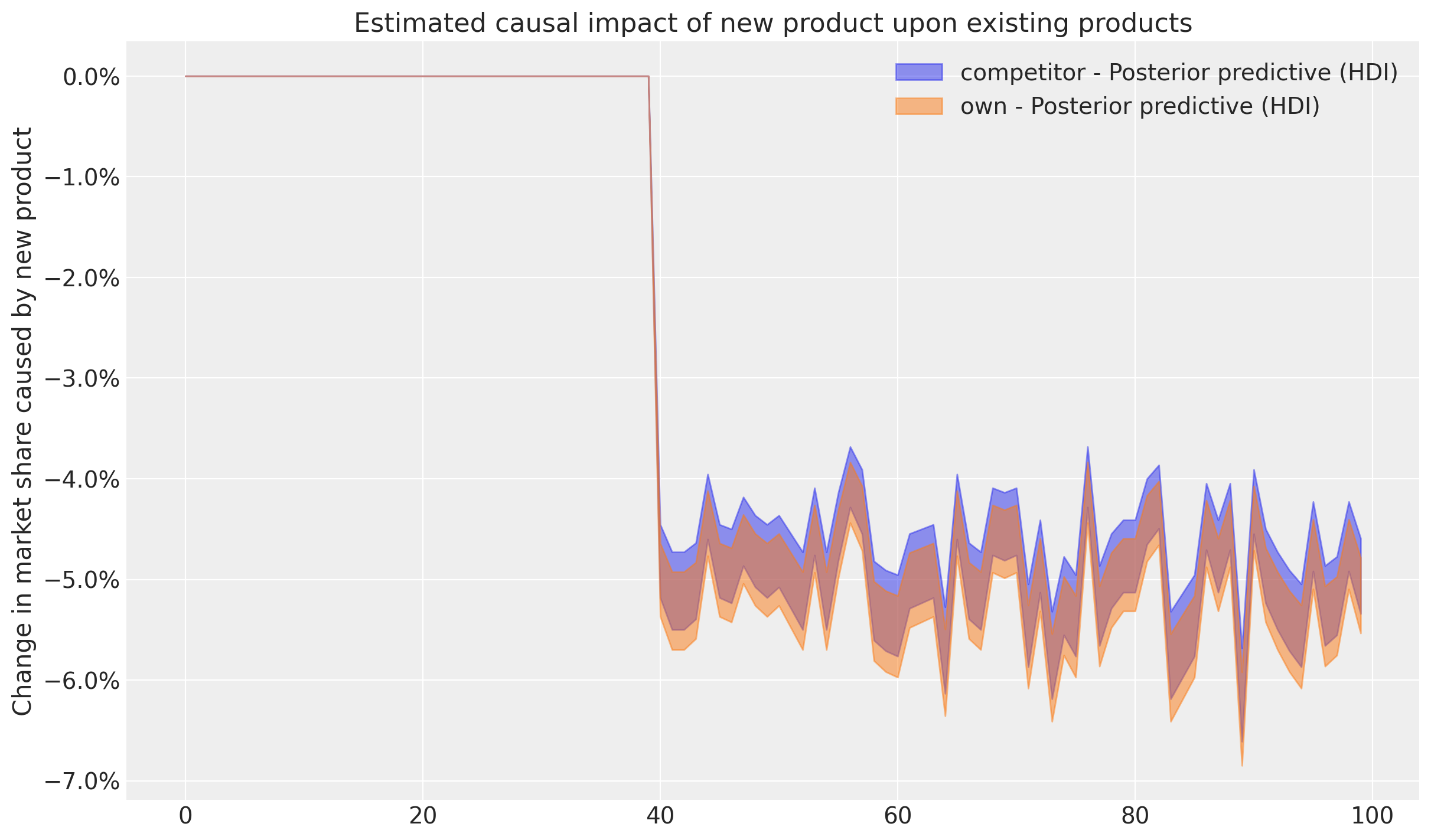 By comparing the two (the model predictions in the actual and the counterfactual scenarios), we have our estimated causal impacts upon each of the existing products of the new product launch. Here we can see that both own and competitor sales were reduced by the launch of the new product sales. So the model is attributing the sales of the new product as having come from both own and competitor sales in (approximately) equal amounts.