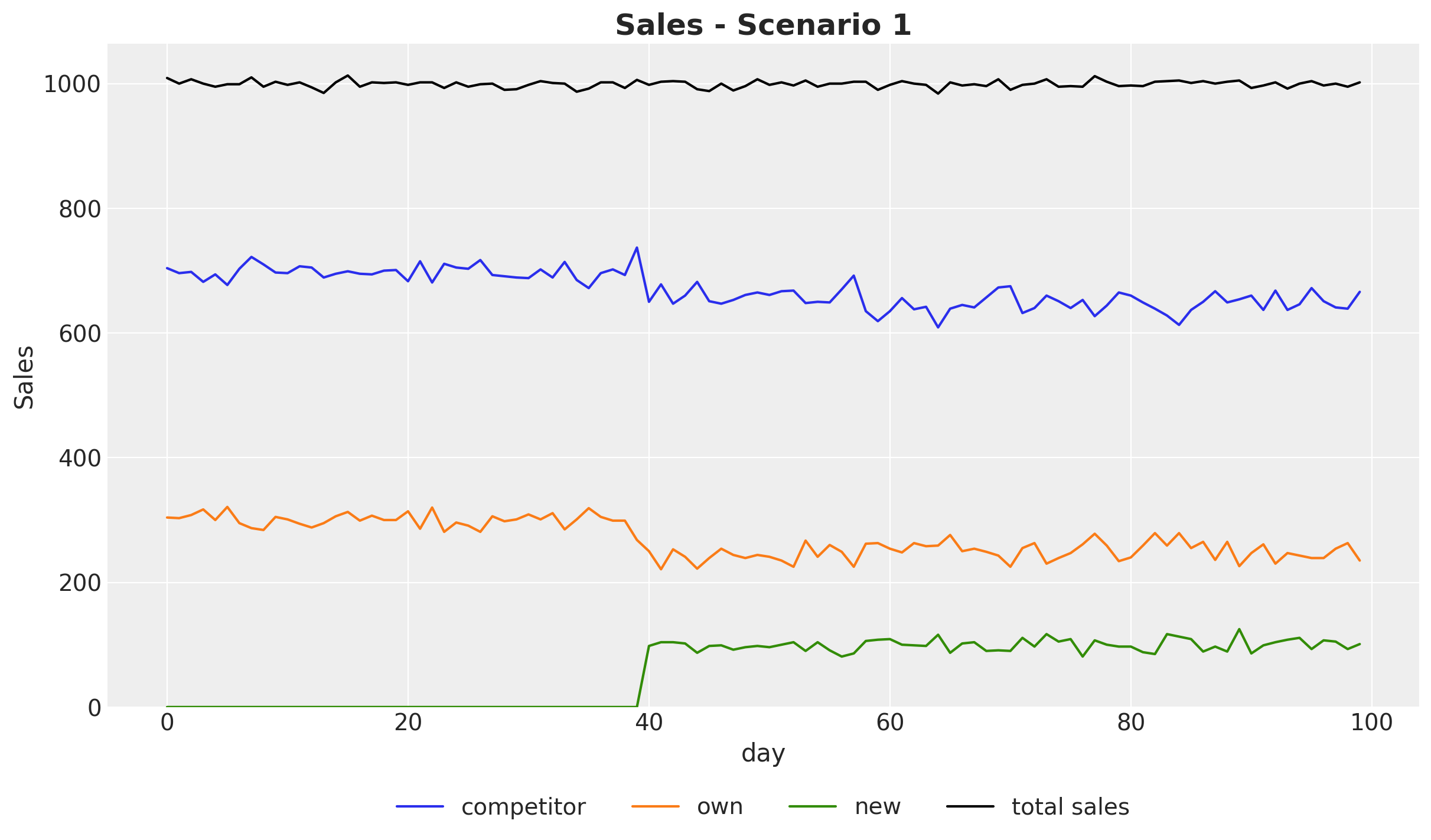Now let’s look at the model’s predicted sales in the counterfactual scenario where the company did not launch the new product. We can evaluate this visually to see if the counterfactual scenario makes sense. In this ultra-simplified example it is easy to evaluate this as a “yes”. The model predicts what we would intuitively expect, that the own and competitor sales would have continued as they were prior to the new product launch.