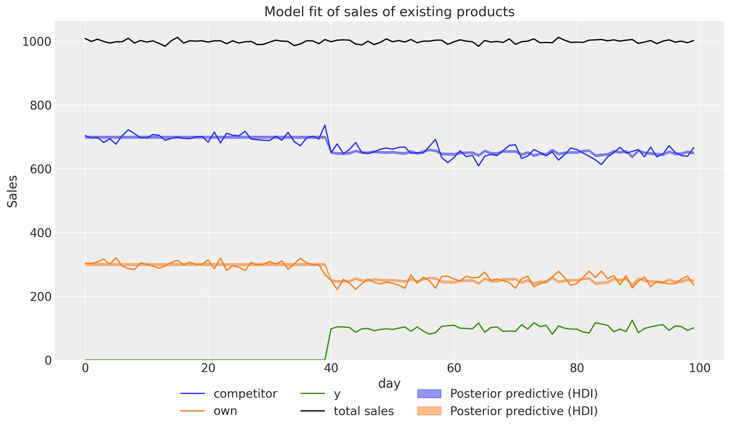 Let’s (visually) evaluate to what extent the model can account for the sales data by plotting posterior predictive fits. The plot below looks pretty good - we can see that the model predictions (shaded regions) capture the main properties of the actual sales data, namely the step change at the time of the new product introduction.