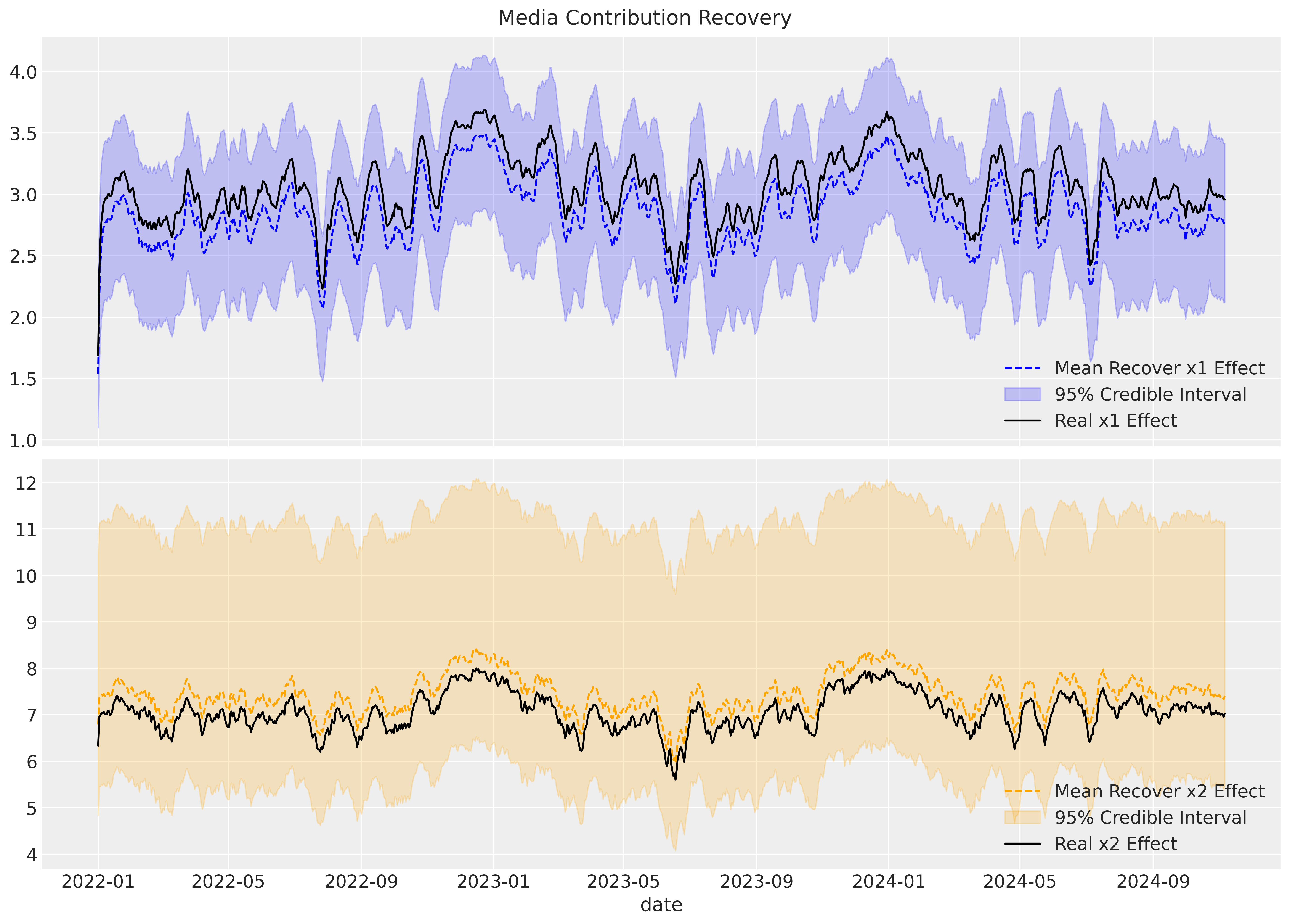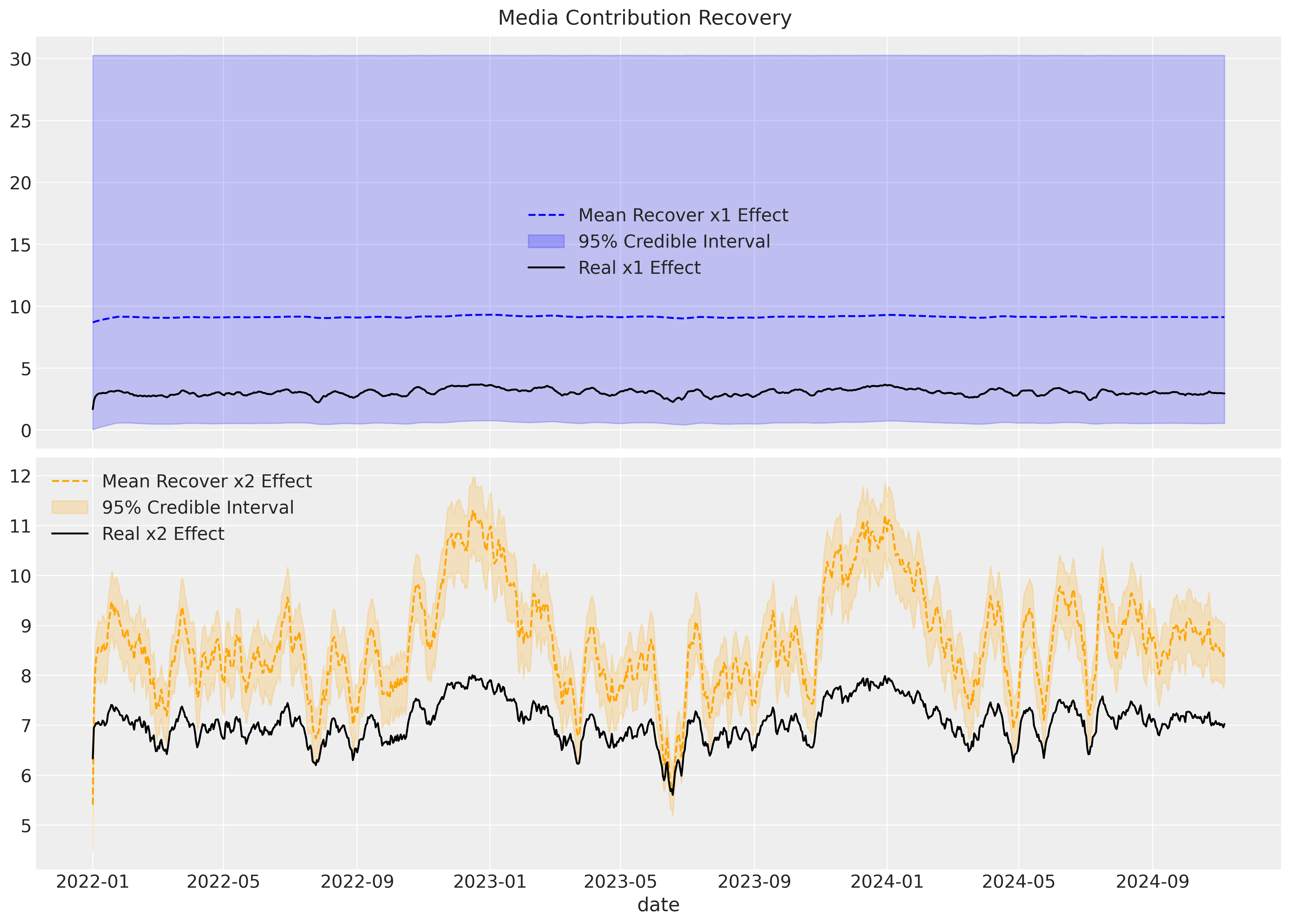 Great news! 🎉 Our model is nailing it when it comes to figuring out the actual impact of our treatment variables. We managed to take into account both the unseen confounders and the things we can see, like holidays.