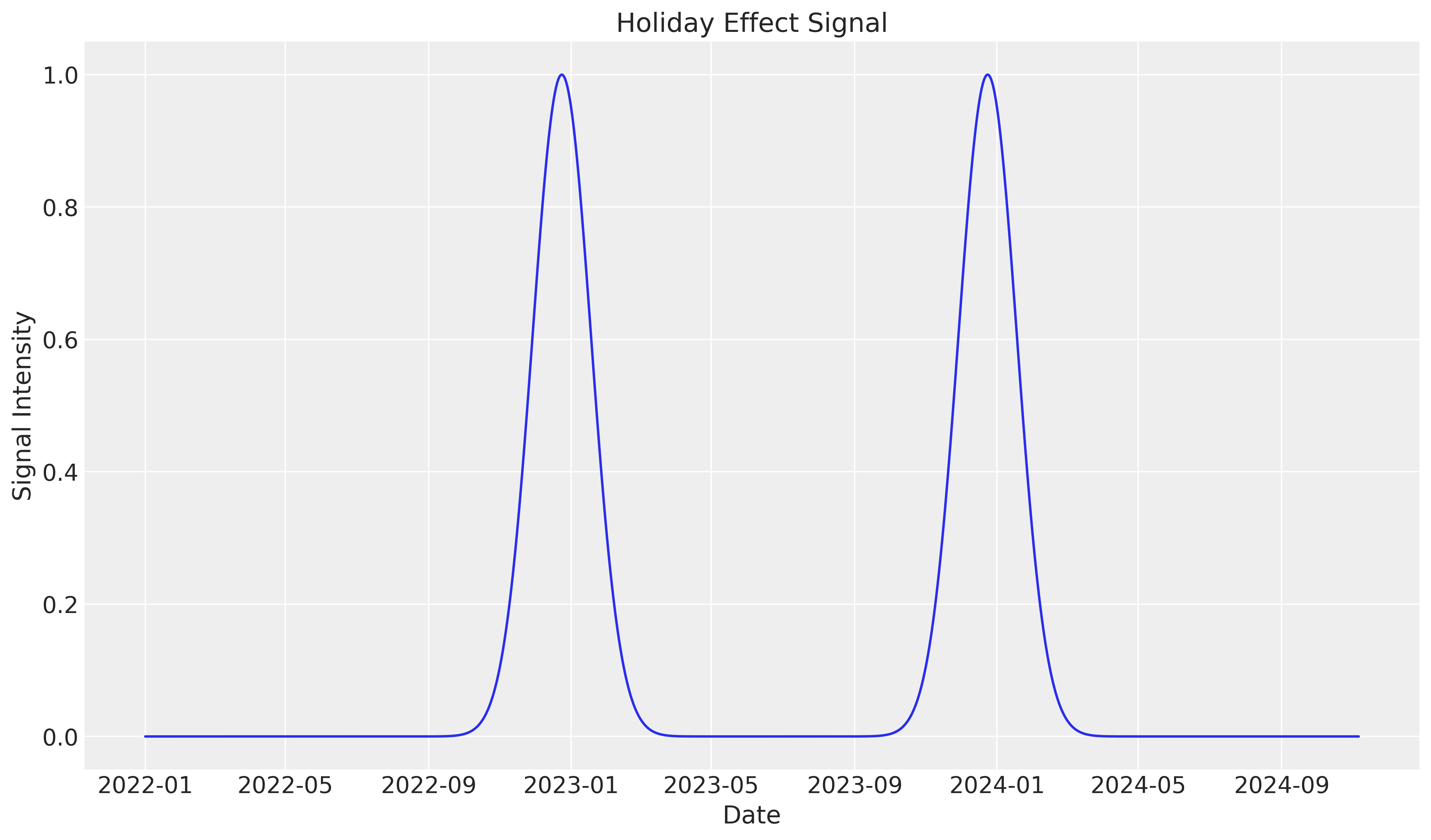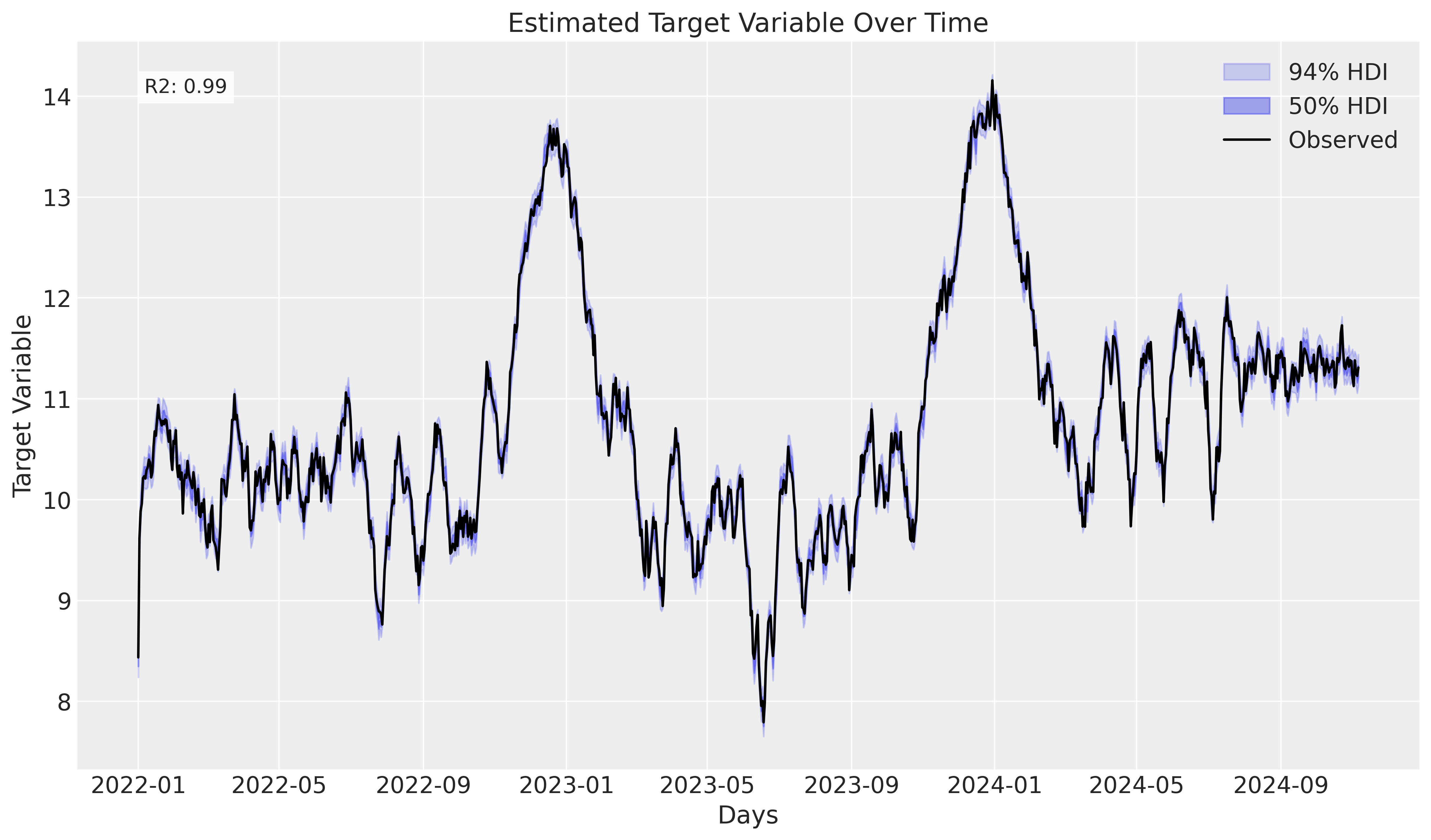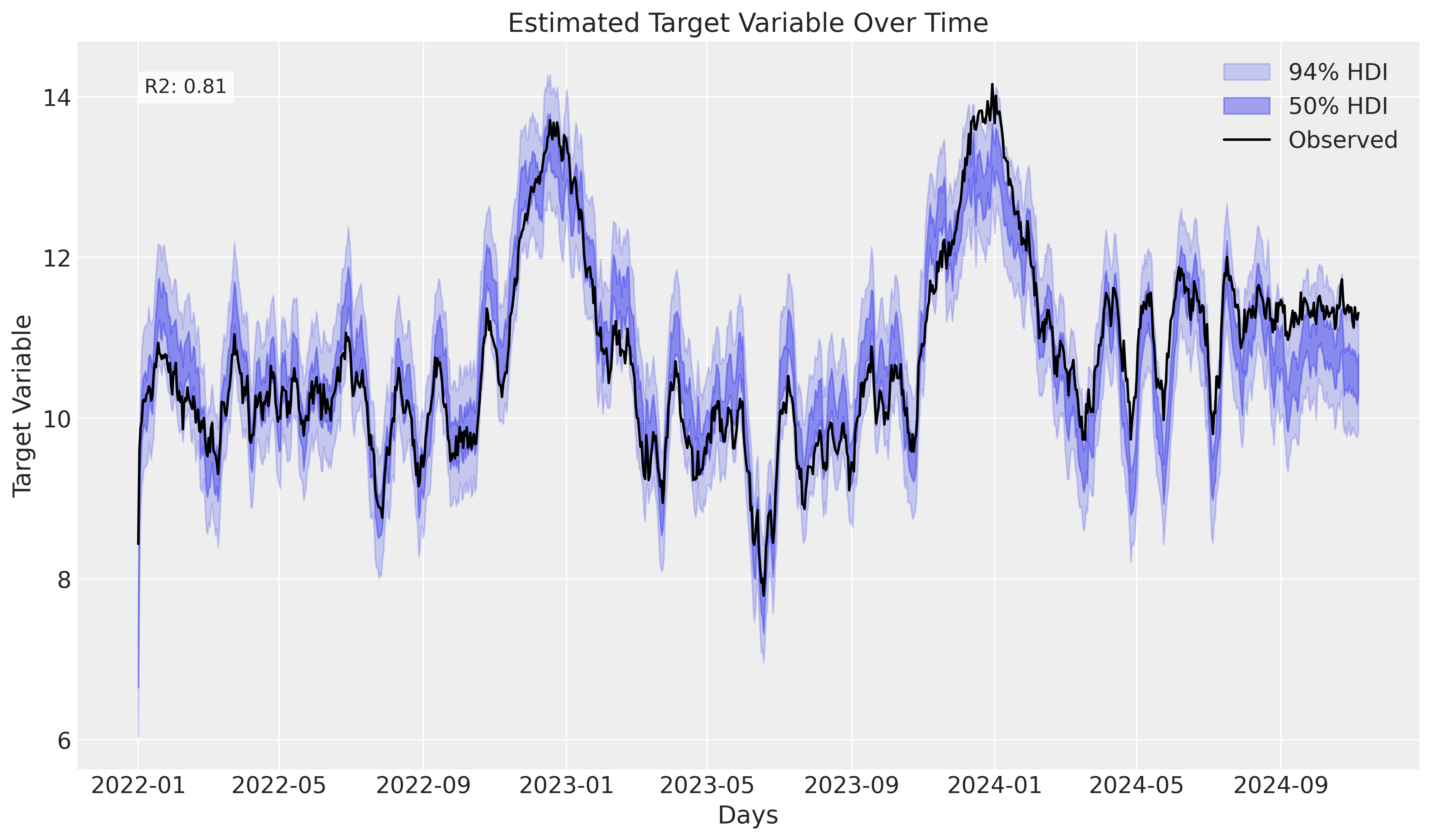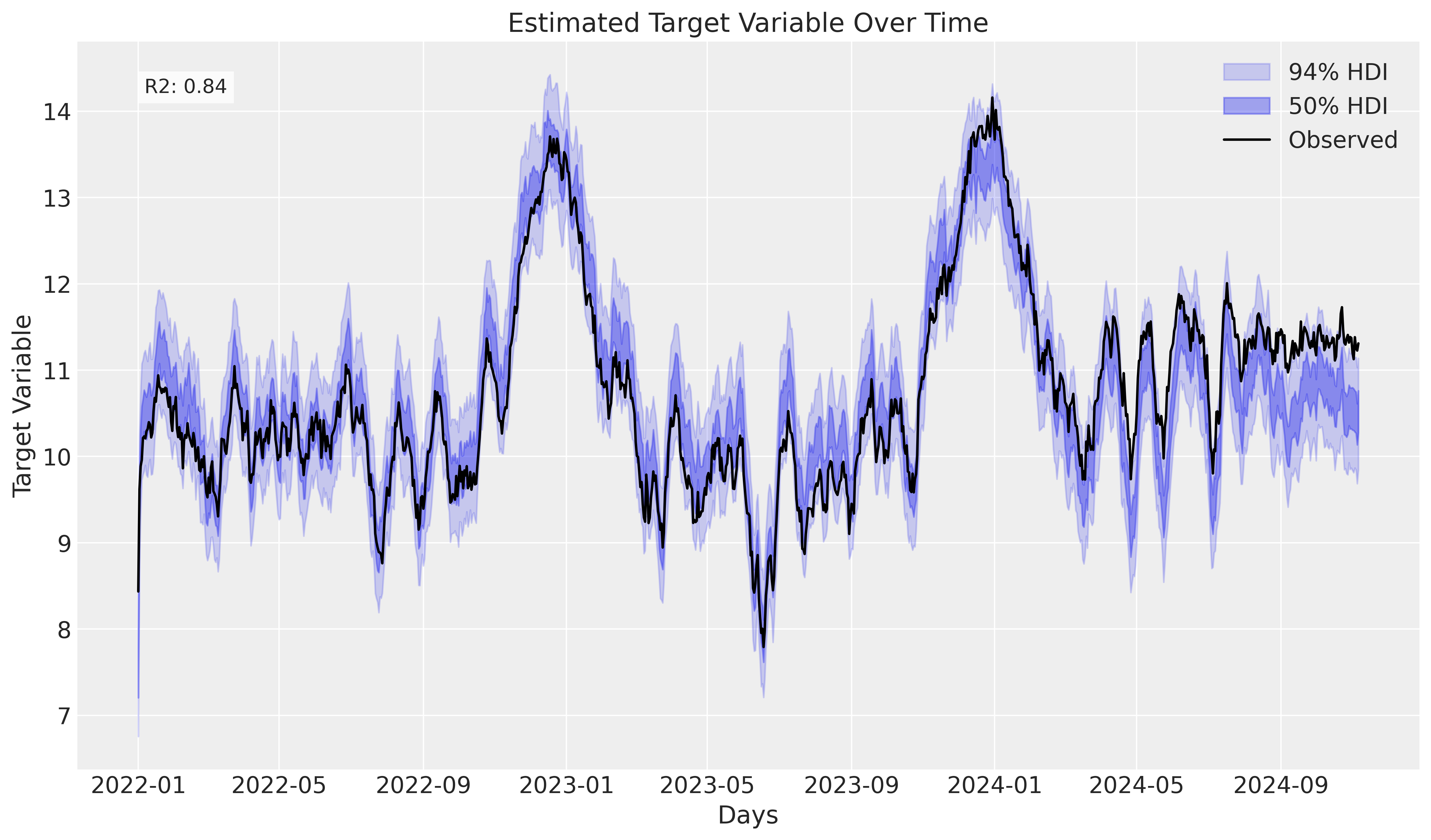 PyMC-Marketing includes Gaussian Processes, using a Hilbert Space Gaussian Process (HSGP) approximation to make calculations more manageable. This allows us to approximate the hidden function \(f(t)\) efficiently.