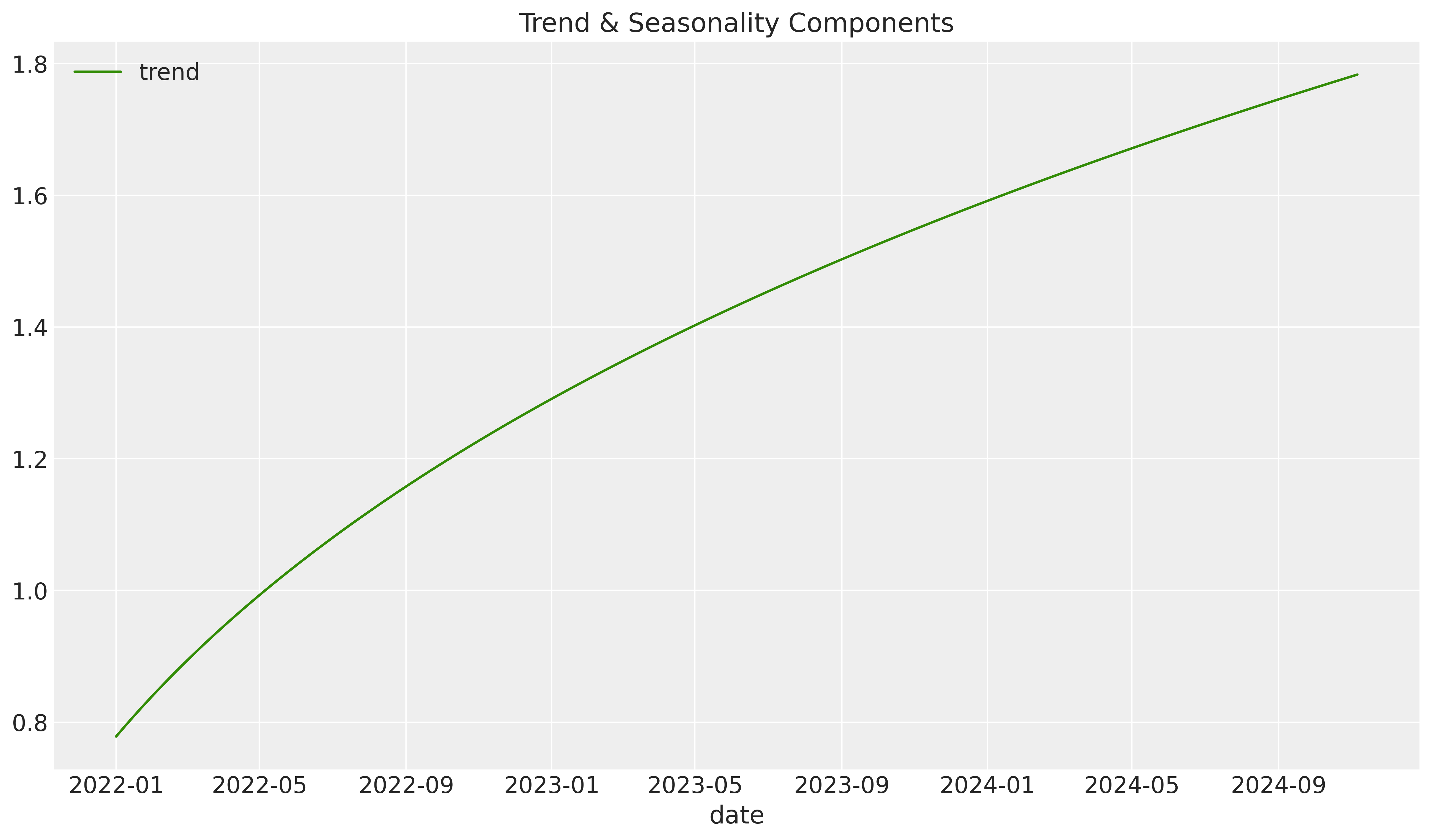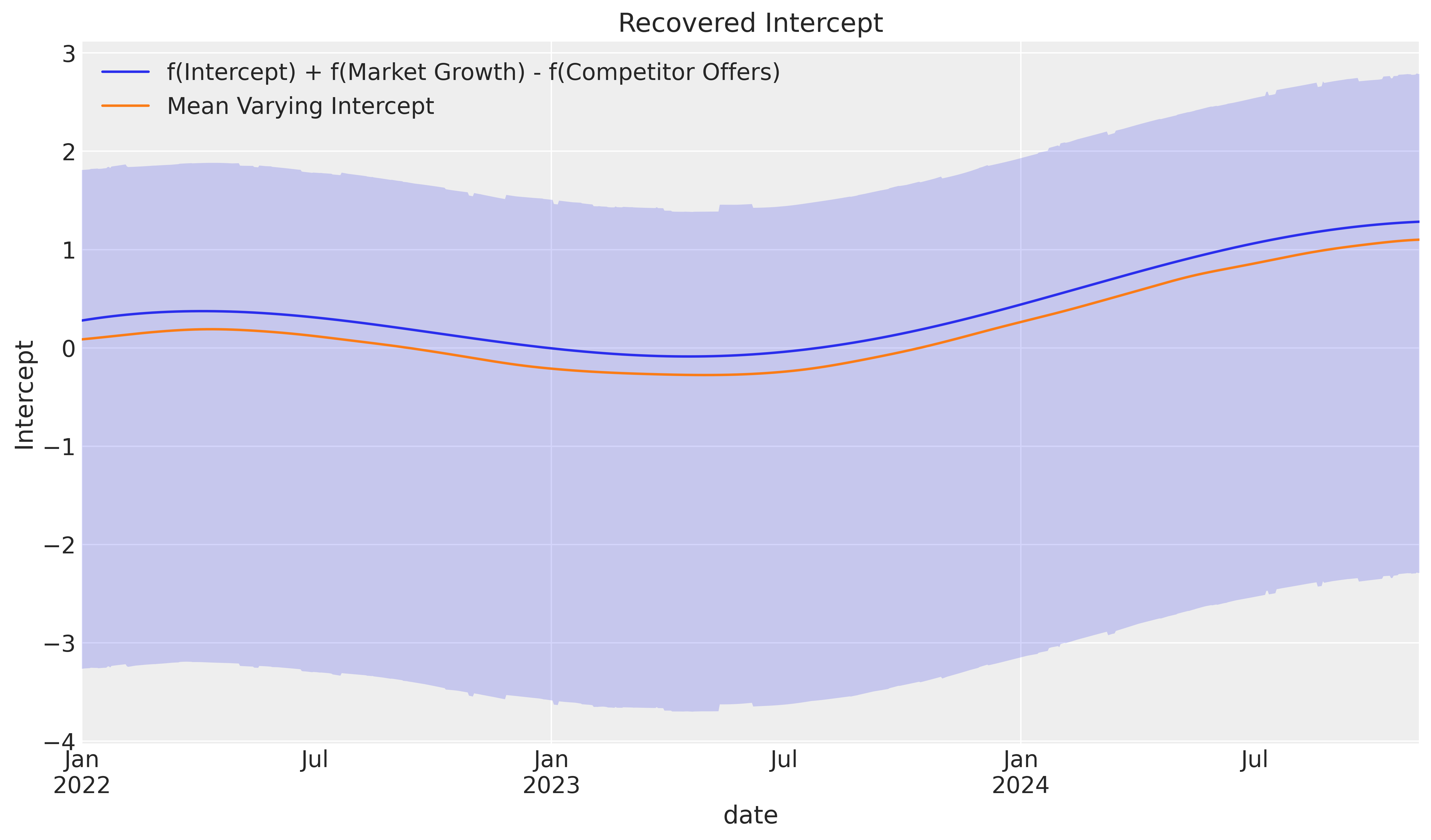 This intercept is really good at picking up on that unobserved confounder and the effect of market growth. Essentially, the Gaussian process is smart enough to guess all those hidden variables affecting our outcome.