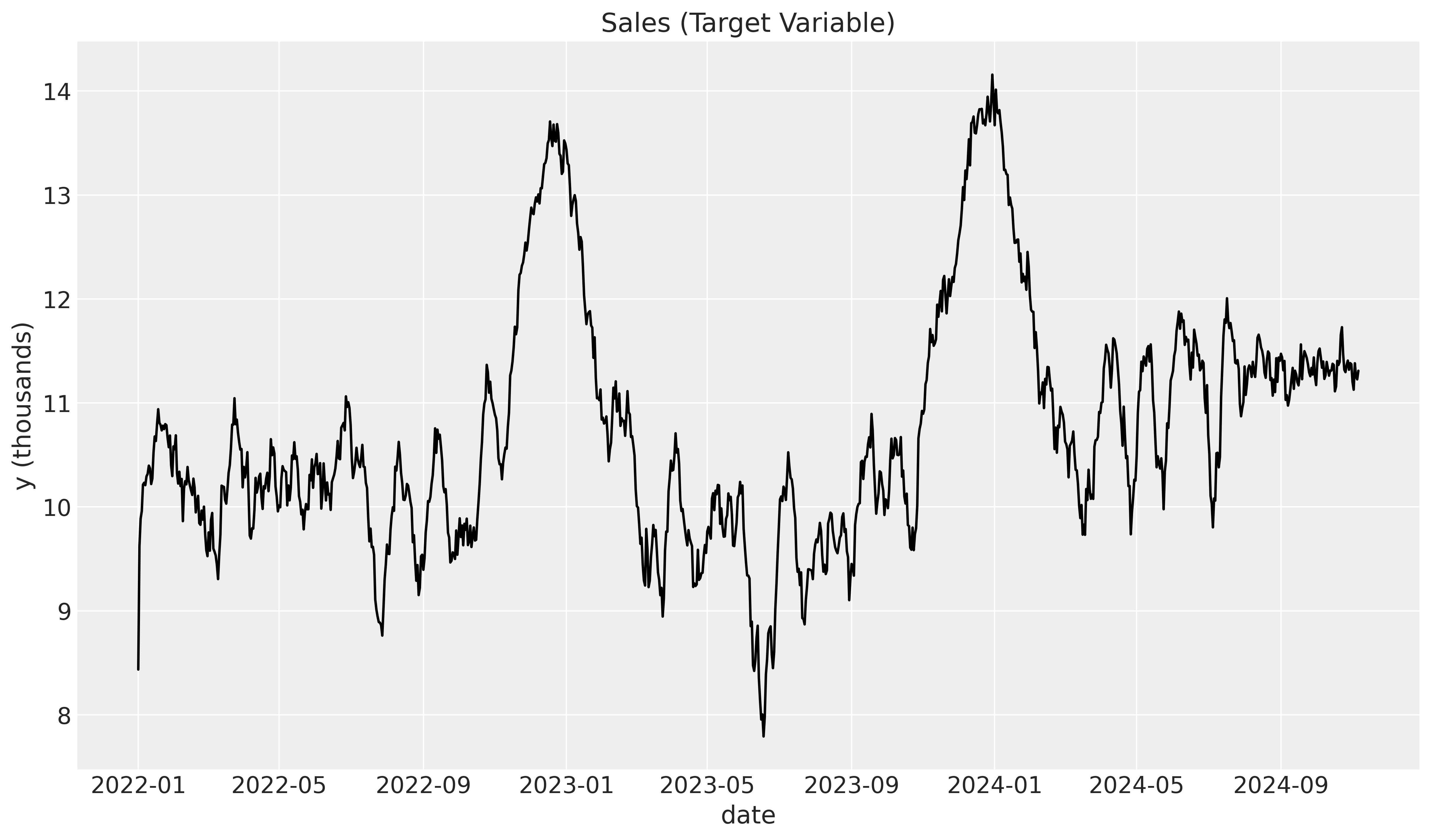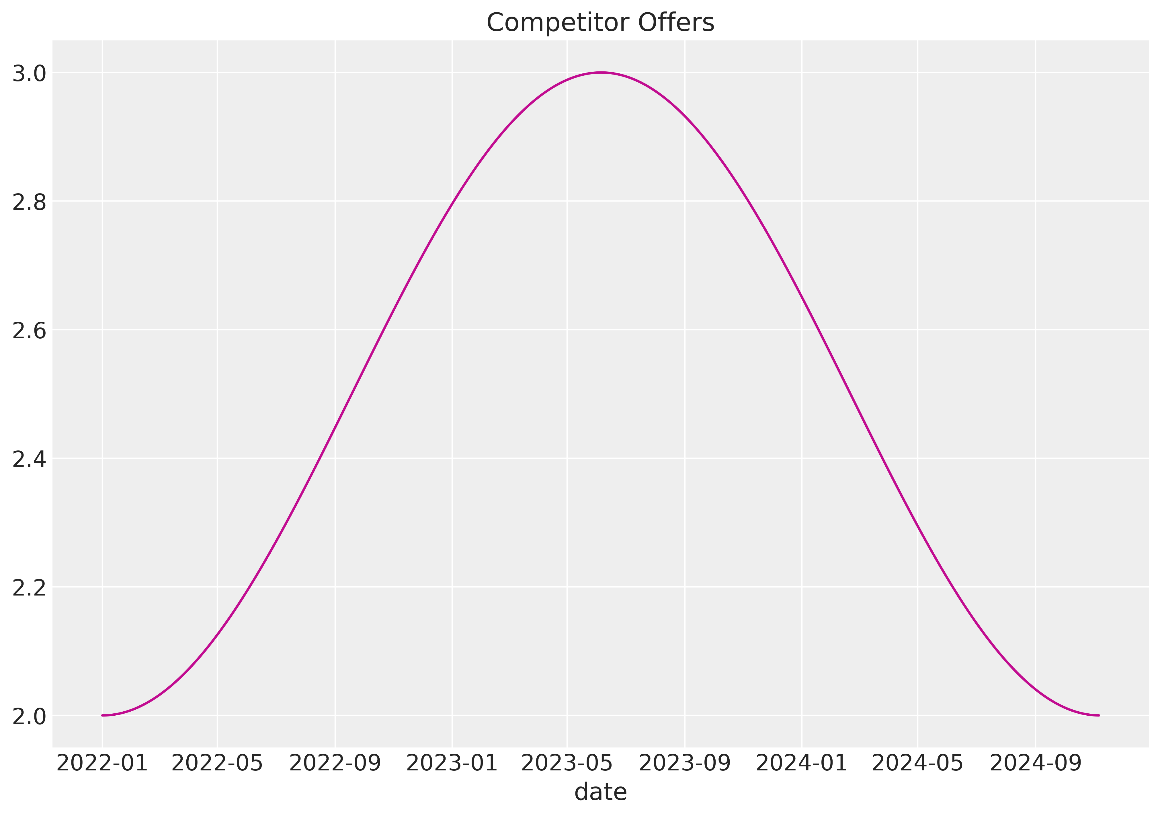 Since we do not directly observe competitor activities like offers or discounts, we can treat ‘competitor_offers’ as a hidden variable. This means we will not measure it directly but will infer its behavior based on its impact on other variables in our model. A Gaussian Process (GP) can help us model this hidden factor, as it is flexible enough to reflect the data’s underlying patterns.