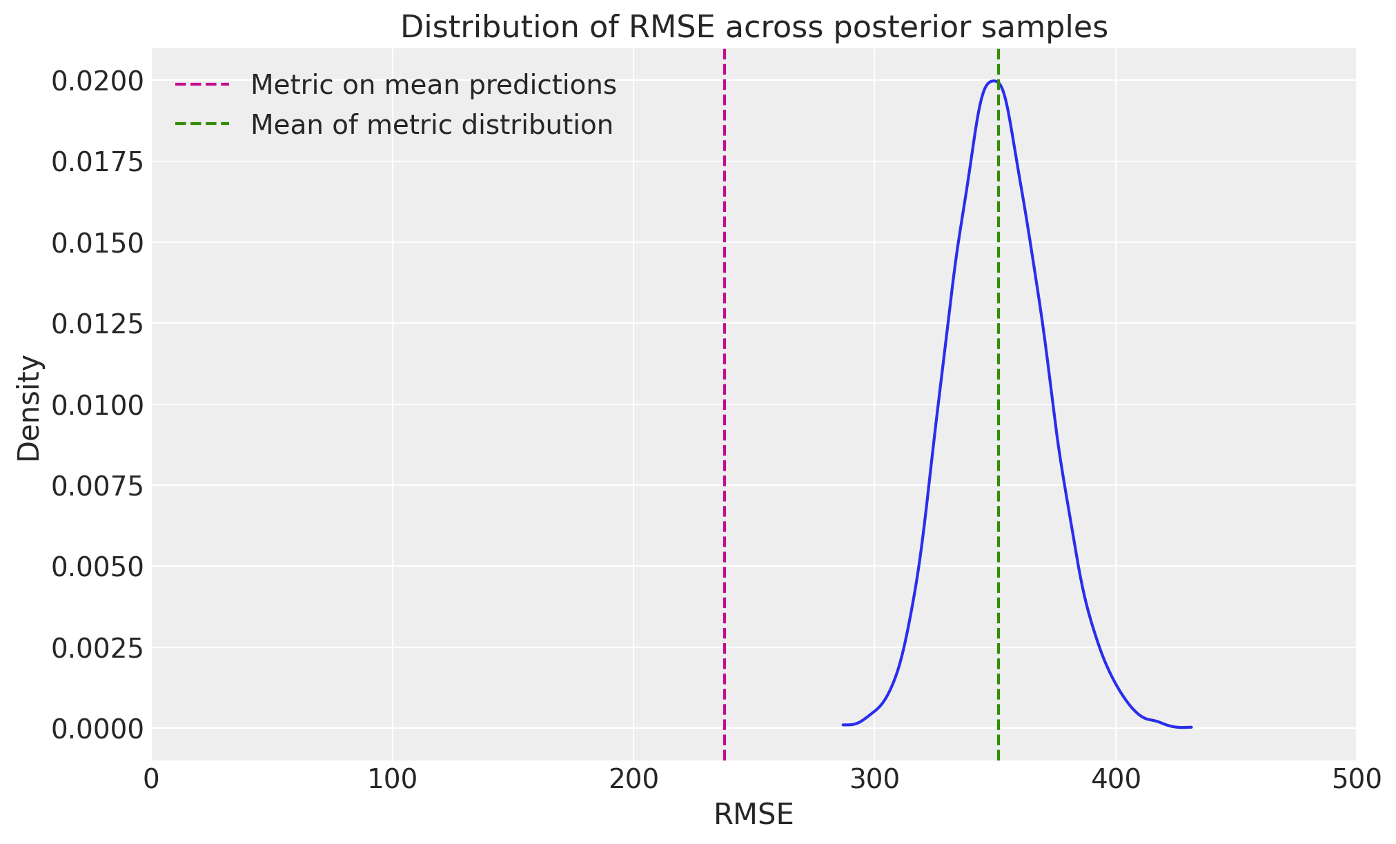 E[f(x)] is not guaranteed to be f(E[x]): This means calculating metrics on mean predictions can give different (and potentially misleading) results compared to calculating the distribution of metrics across posterior samples.