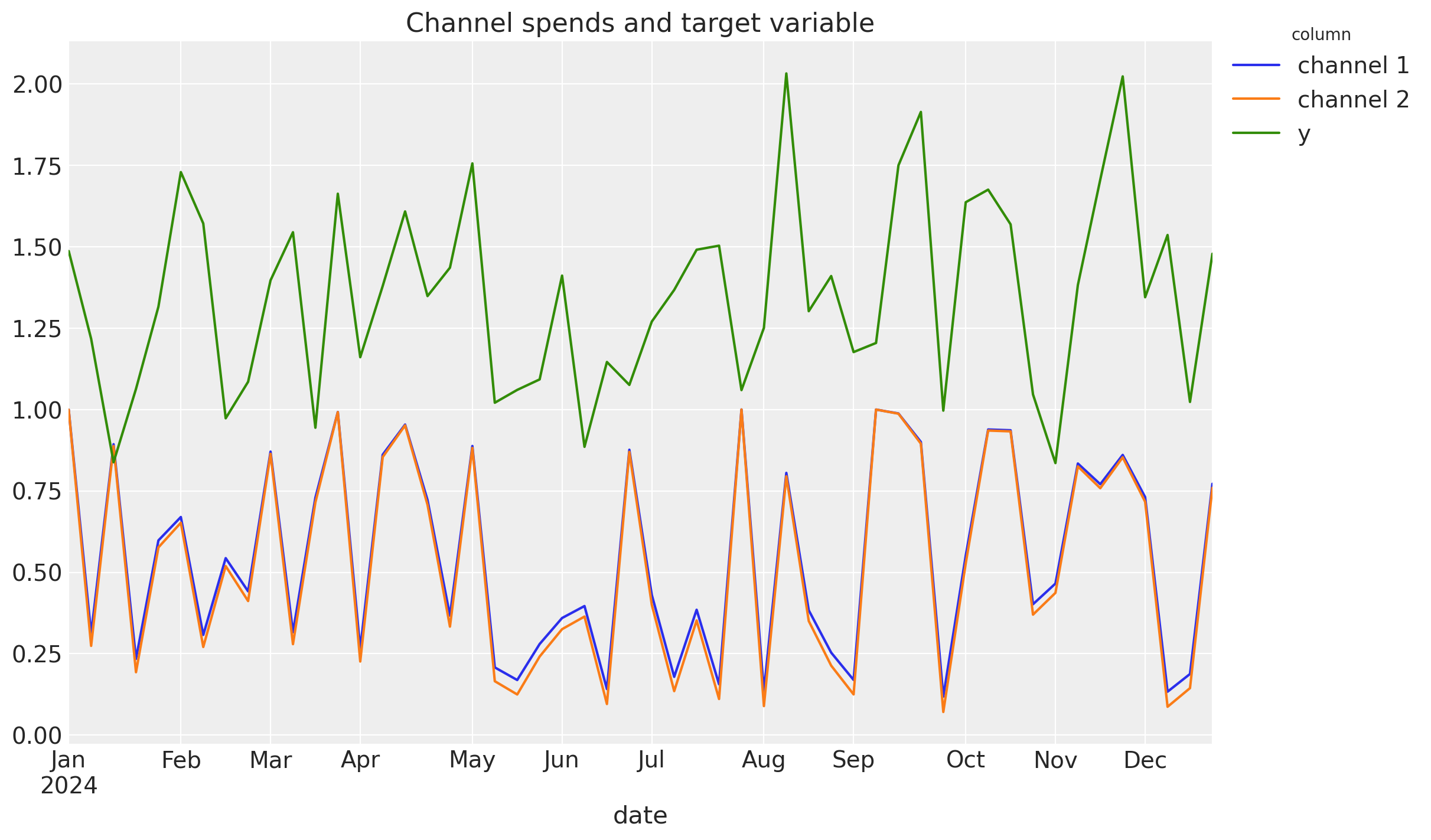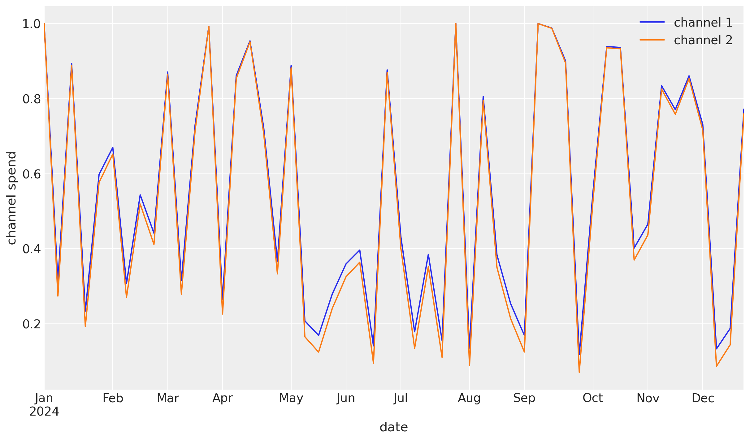 For this example, the synthetic spend data is not produced in a overly realistic manner. However, we have normalized the maxmium spend to 1 for each channel to mimmick data pre-processing that typically takes place in a pymc-marketing workflow.