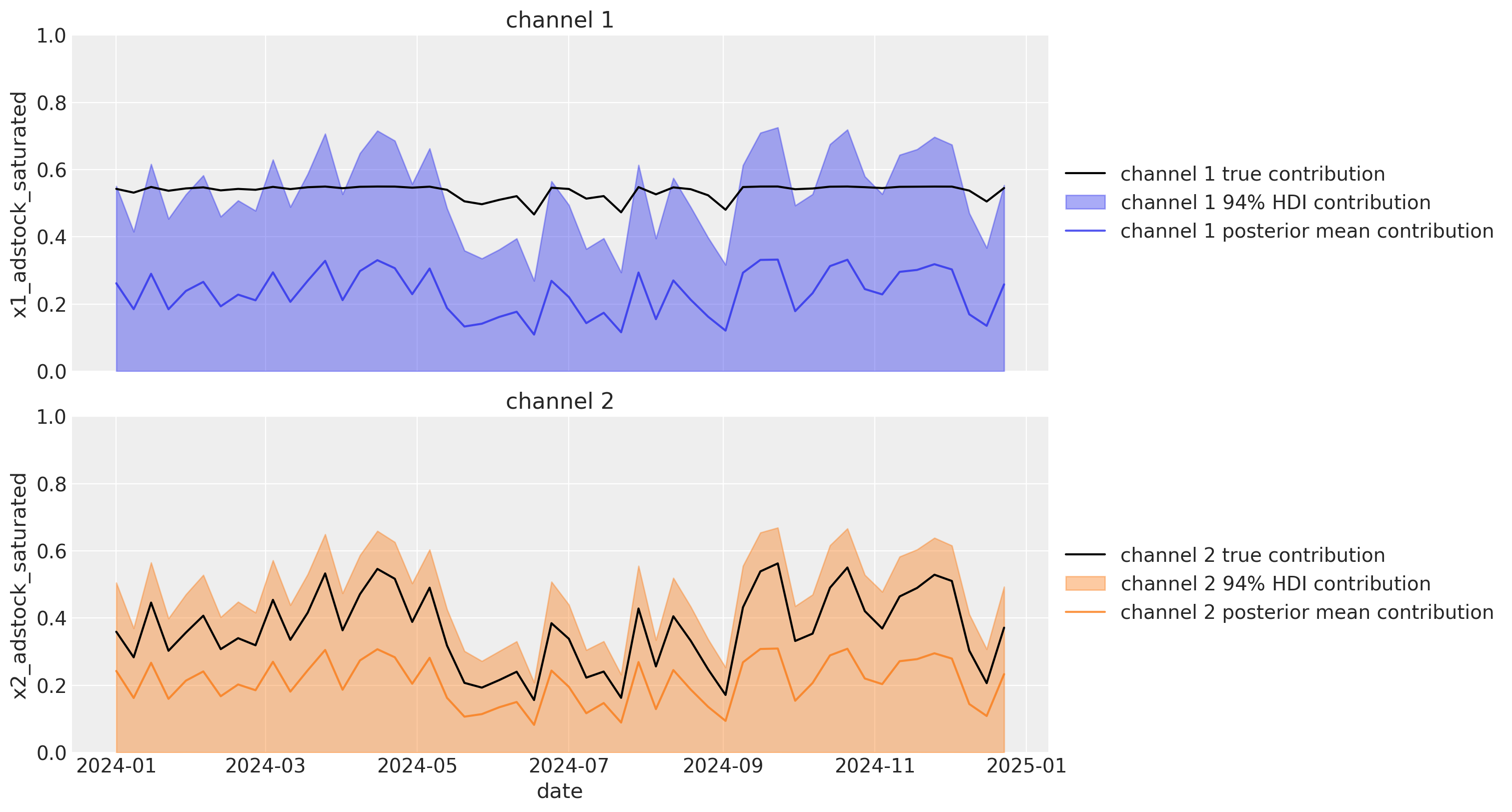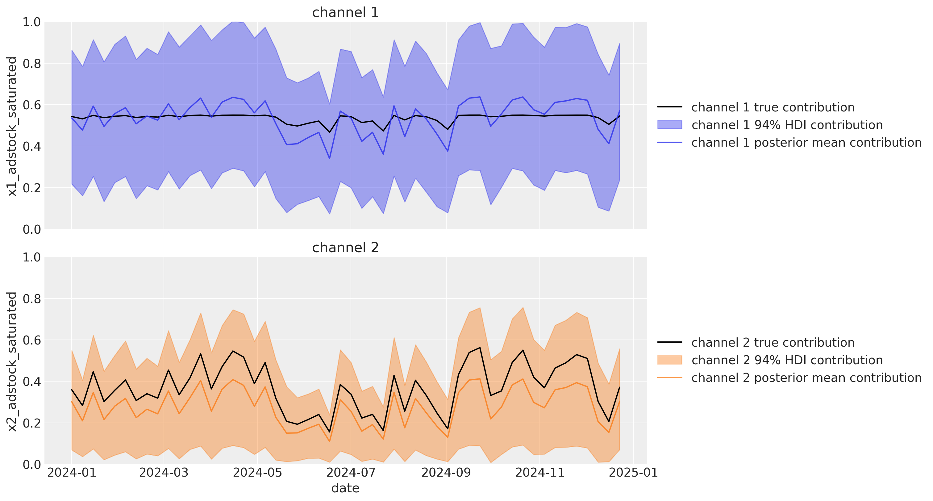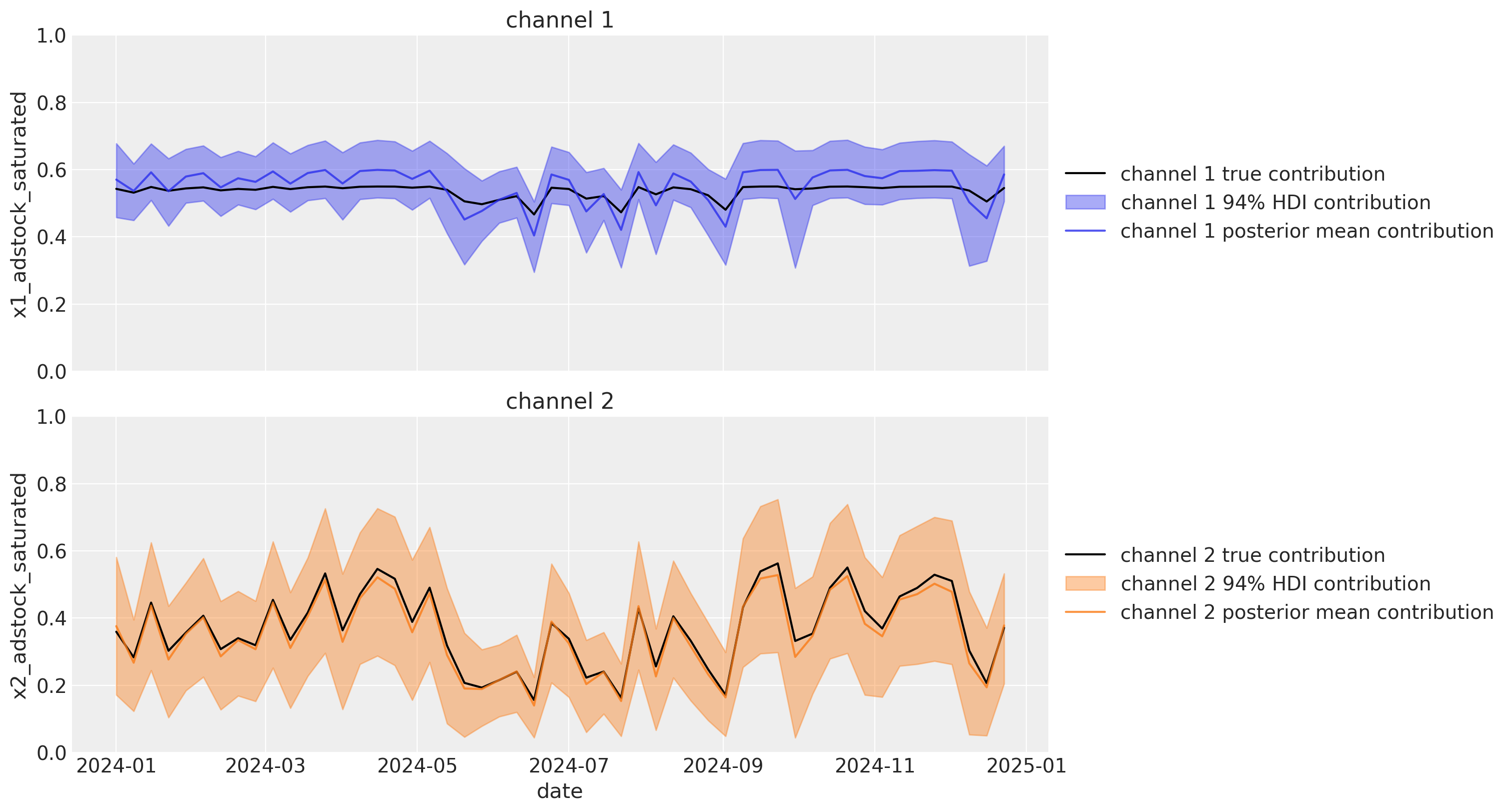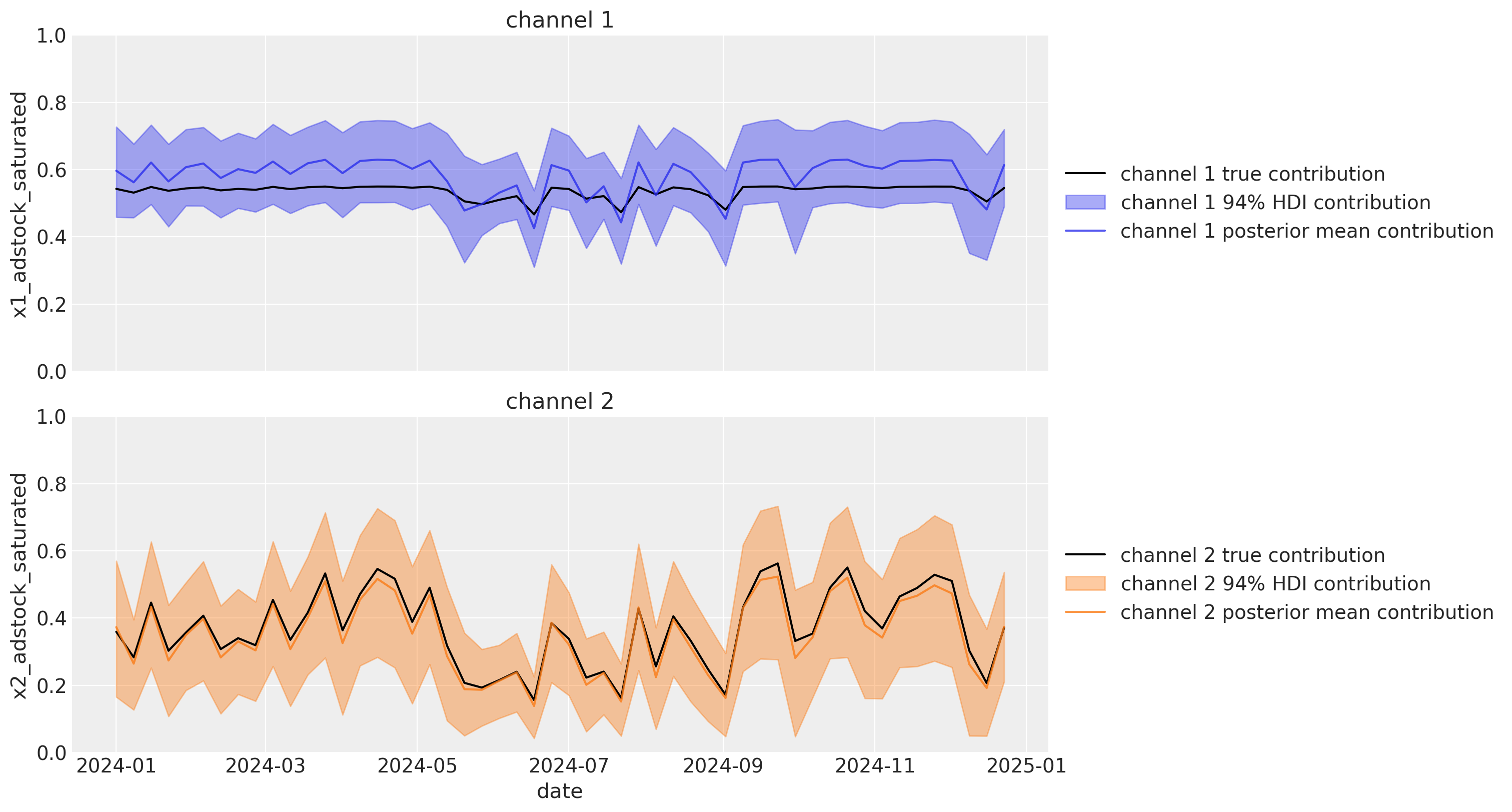 Now, for a final time, let’s check in on our channel contributions over time. The HDI’s are much narrower when we compare to the original model - adding a number of lift test results has reduced our uncertainty in our channel contribution estimates. And the posterior means are now much closer to the actual channel contributions compared to before we added the lift test data to the MMM.
