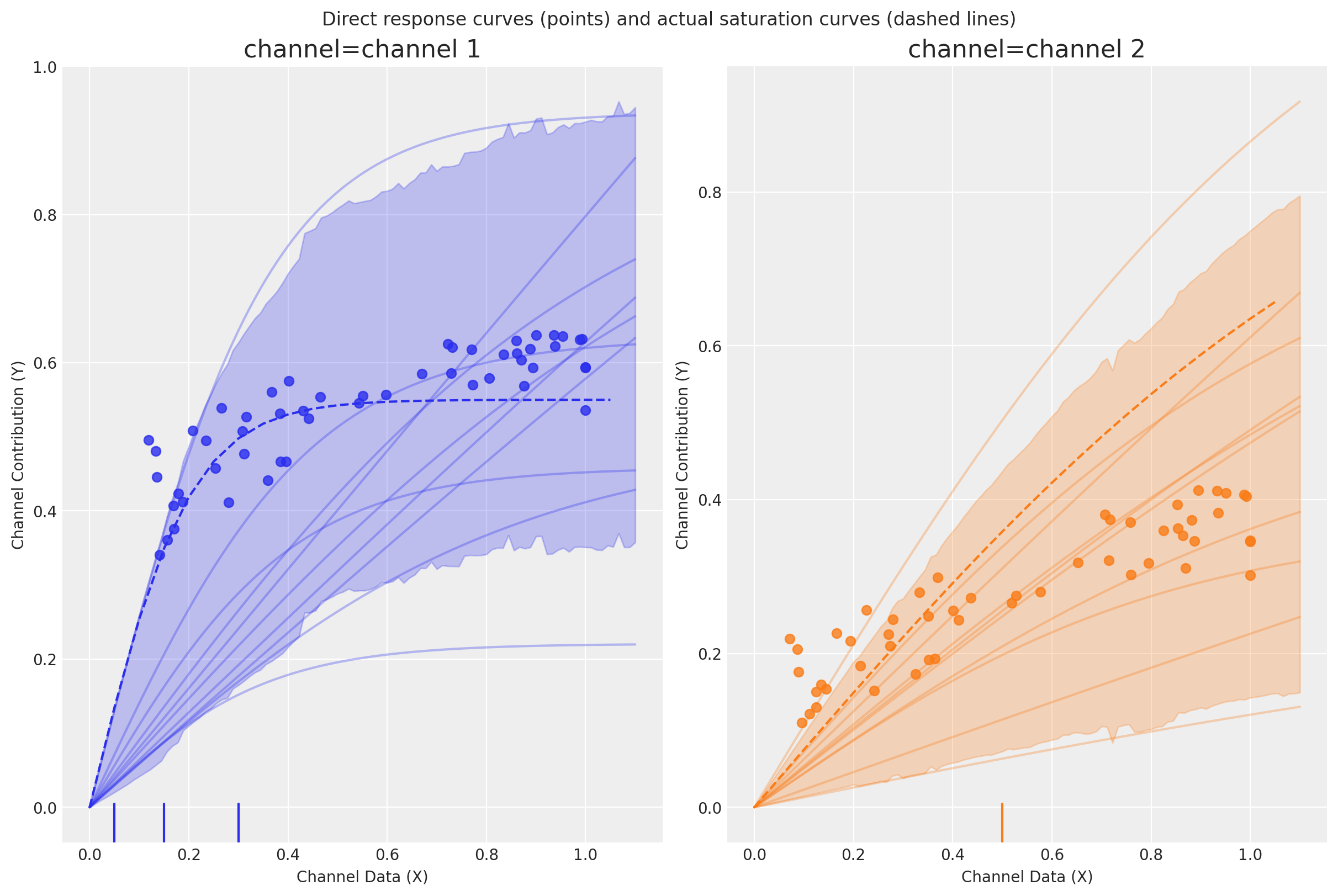 So we can see in the 2 plots above that when we add even more lift test data to our MMM, the parameter estimates relating to the saturation curves are getting closer to the true values.