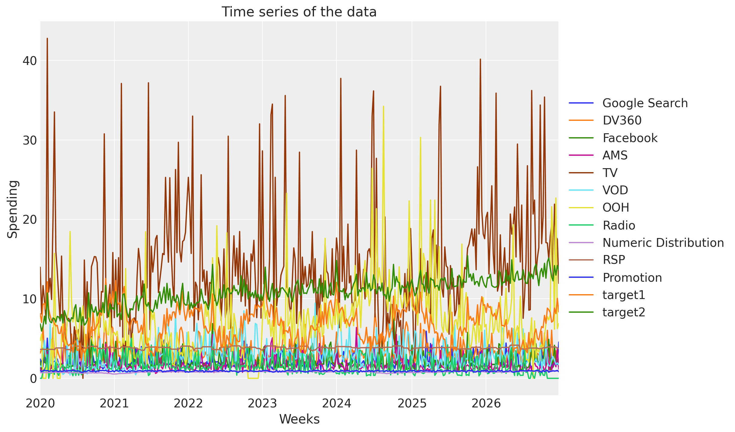 Weeks | Google Search | DV360 | AMS | TV | VOD | OOH | Radio | Numeric Distribution | RSP | Promotion | target1 | target2 | ||