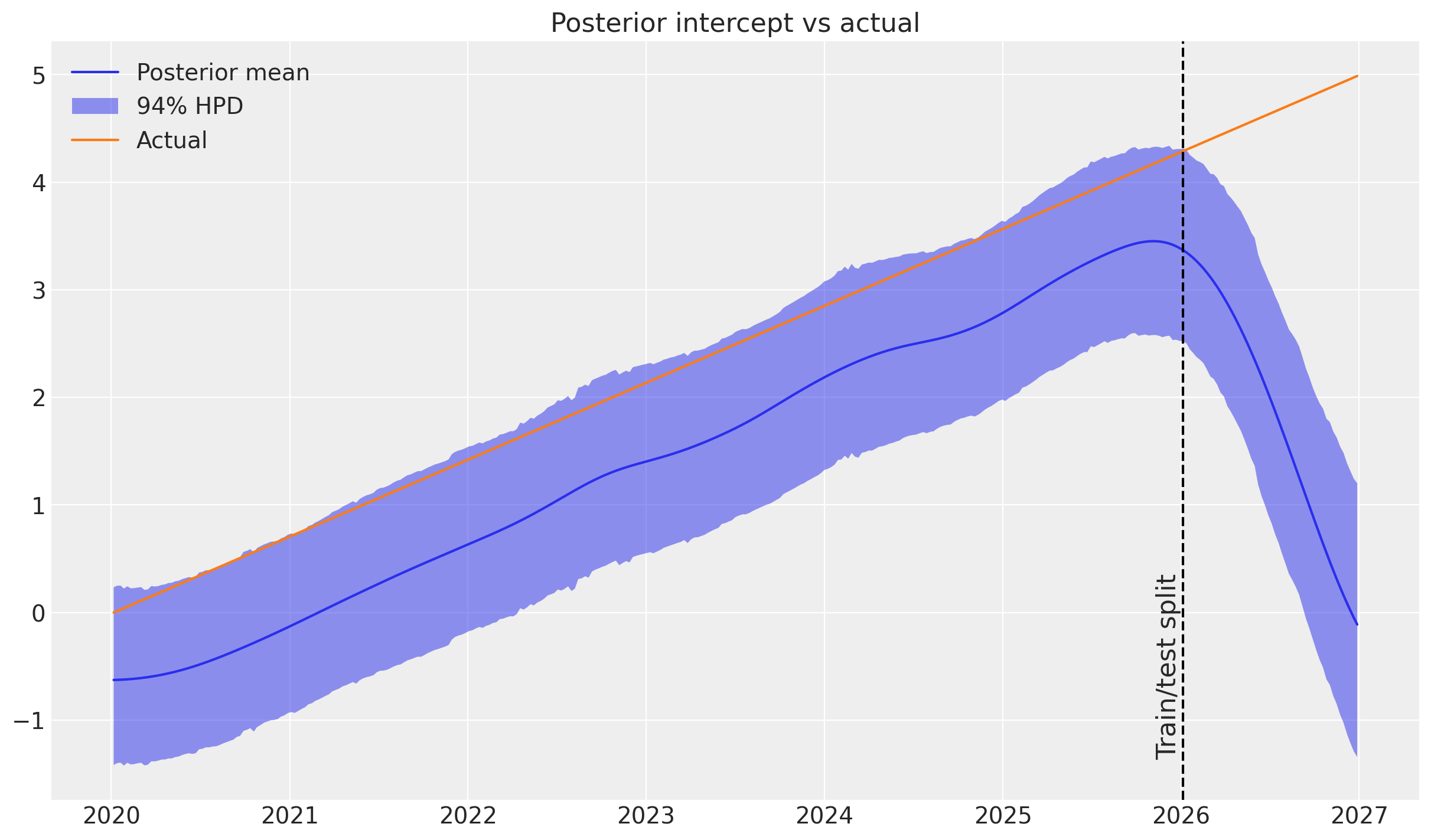 🎉 Success! As hypothesized, the time-varying intercept now captures the events better, and at the right scale! Notice how lowering the length-scale prior mean from the default two years to one year makes the series more squiggly.
