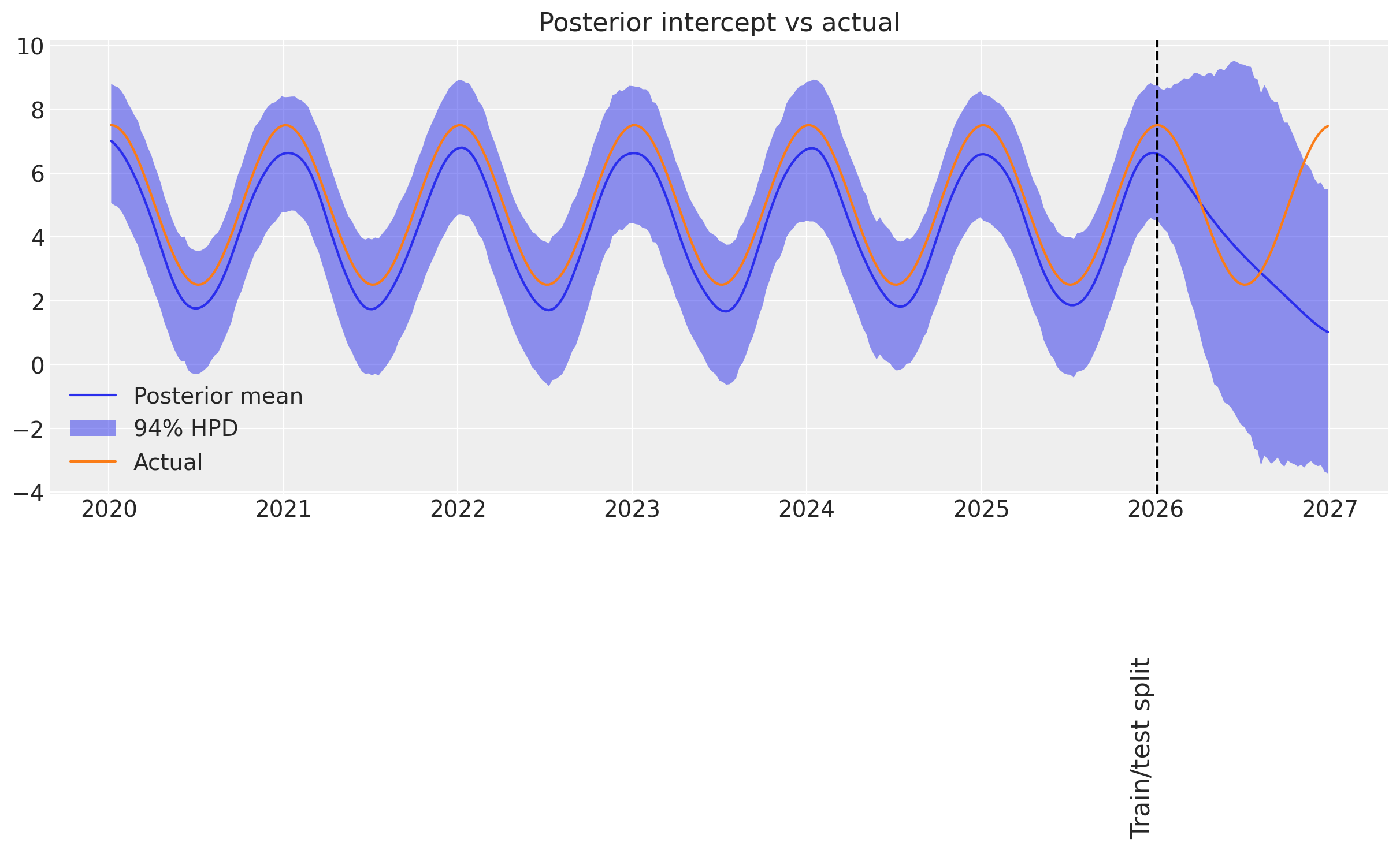 Yearly seasonality: The intercept is a cosine function with a period of one year. Normally, one would use a Fourier basis to model seasonality, but let’s see what happens when we use a time-varying intercept 🤷♂️.